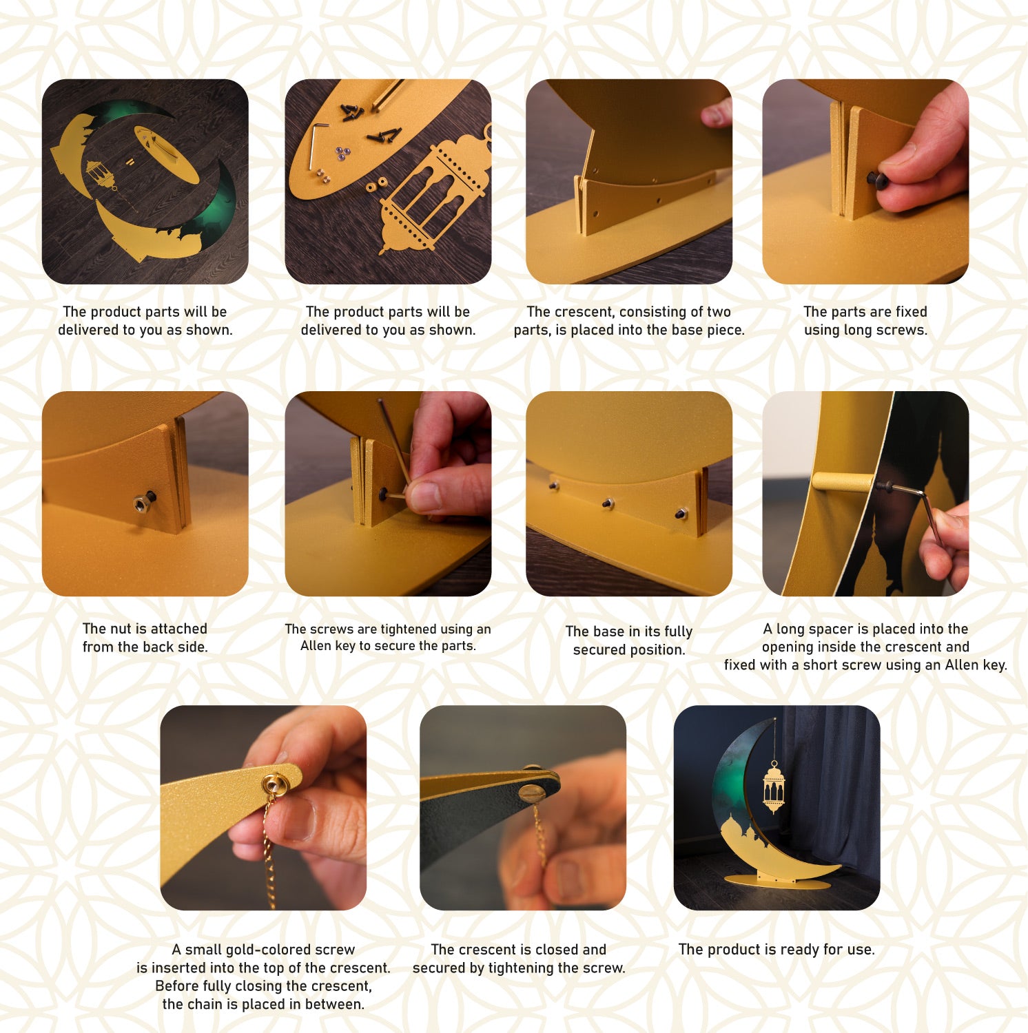 The product arrives flat; the crescent takes its three-dimensional form as the pieces are assembled by the user. This moment is more than installation—it marks a meaningful beginning. The permanence of metal and the elegance of the crescent come together to create a balanced and refined presence within the space.